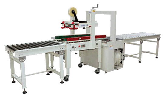 封箱机(纸箱胶带封口)+高解析喷码机(日期、批号、厂名等信息喷印打码设备)+自动打包机(自动打出两道PP带。进行纸箱捆扎包装)